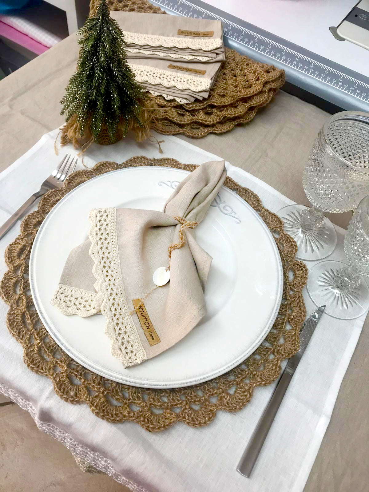 Servilleta en lino lavado y detalles en crochet, combinando elegancia y tradición.